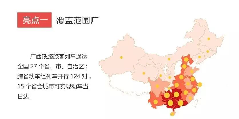 通过重点在南广、贵广线上和广西北部湾城市间增开动车,进一步密切北部湾城市群与周边广东、贵州之间的联系,促进泛北部湾地区经贸合作与交流。其中,新增13对直通动车组列车:北海至广州南2.5对,南宁东至广州南4.5对,桂林北至广州南4对,广州南至贵阳北2对;新增6.5对管内动车组:南宁东至北海3对,桂林至柳州、南宁东至百色各1对,桂林至北海、南宁至北海、柳州至南宁各0.5对。