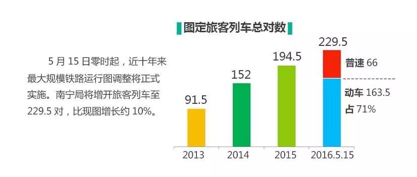 5月15日零时起,近十年来最大规模铁路运行图调整将正式实施。南宁铁路局将增开旅客列车36.5对,图定旅客列车总对数增至229.5对,比现图增长约10%。其中动车组列车开行对数达163.5对,占列车开行总数的71%,动车成为广西铁路运输主力,让更多壮乡群众享受到高铁红利。