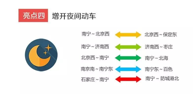 根据铁路总公司关于利用外属过夜非检修动车组大力增开夜间动车组的要求,新图实施后南宁局利用动车组运输能力,共安排开行夜间动车组5对:南宁至北京西、南宁至济南西动车组夜间终到后,南宁铁路局担当开行北京西至保定东、济南西至枣庄各1对夜间动车组;利用外局夜间终到南宁铁路局的动车组,在南宁至北海、南宁至百色、南宁至防城港北间分别增开1对夜间动车组,为夜间出行的群众提供了便利条件。