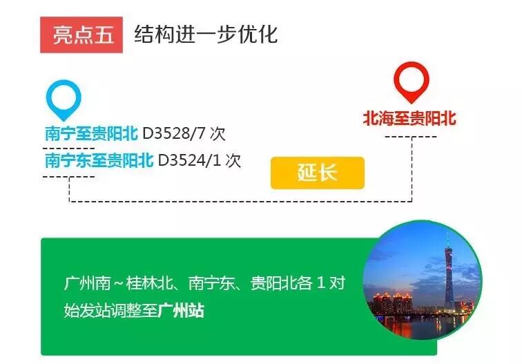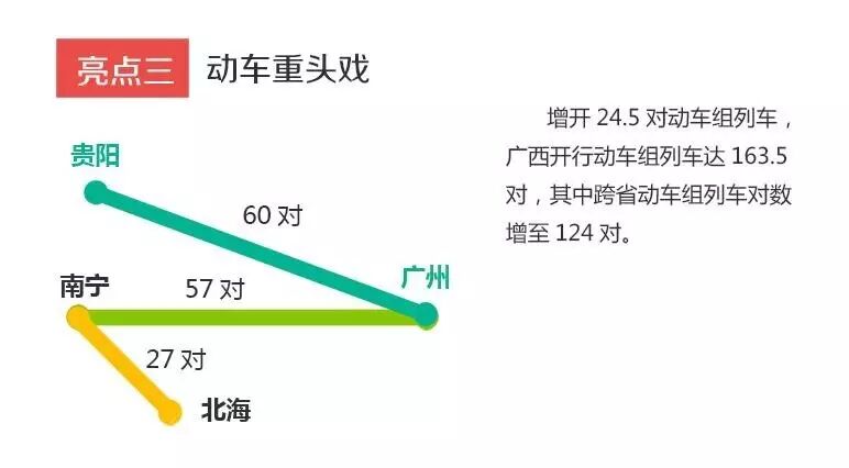 其中,将南宁至贵阳北D3528/7次、南宁东至贵阳北D3524/1次调整为北海至贵阳北,使广西北海旅游名城与“醉美”贵州首次实现高速直通,为两地间旅游协同发展搭起了“金桥”;将原广州南至桂林北、南宁东、贵阳北间各1对动车调整为广州至贵阳北、桂林北、南宁东间开行,广西动车首次在羊城进入广州站,增加了人民群众的出行选择。