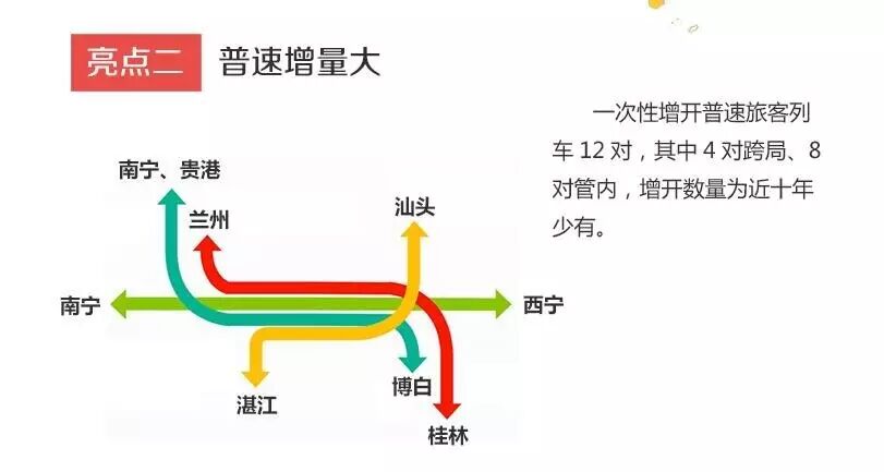 跨局普速列车方面:新增南宁至西宁快速旅客列车1对,广西列车首次驶入青藏线,广西与青海两省区间实现了直连直通;新增桂林北至兰州快速旅客列车1对,进一步密切了西部地区之间的交流合作,有效缓解了广西往西北地区运能不足的矛盾;新增湛江至汕头快速旅客列车1对,使粤西、粤东地区间的联系更紧密。