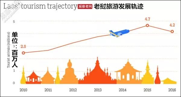 一旦建成,从中国昆明到新加坡仅需要10个小时。同时报道还称,今年5月,四川航空在昆明和万象之间开通了一条直航线路,而去年,海南航空已经开设了海口到万象的直航班机。  ▲老挝旅游发展轨迹图